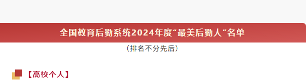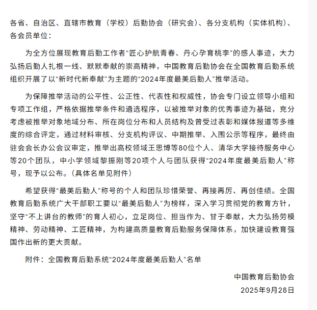 本次评选,中国教育后勤协会最终评选出高校领域的60项个人(山东省3所高校个人获此殊荣)、40项团队,中小学领域的20项个人与团队入围“2024年度最美后勤人”。(撰稿:周永斌 审核:梁平)