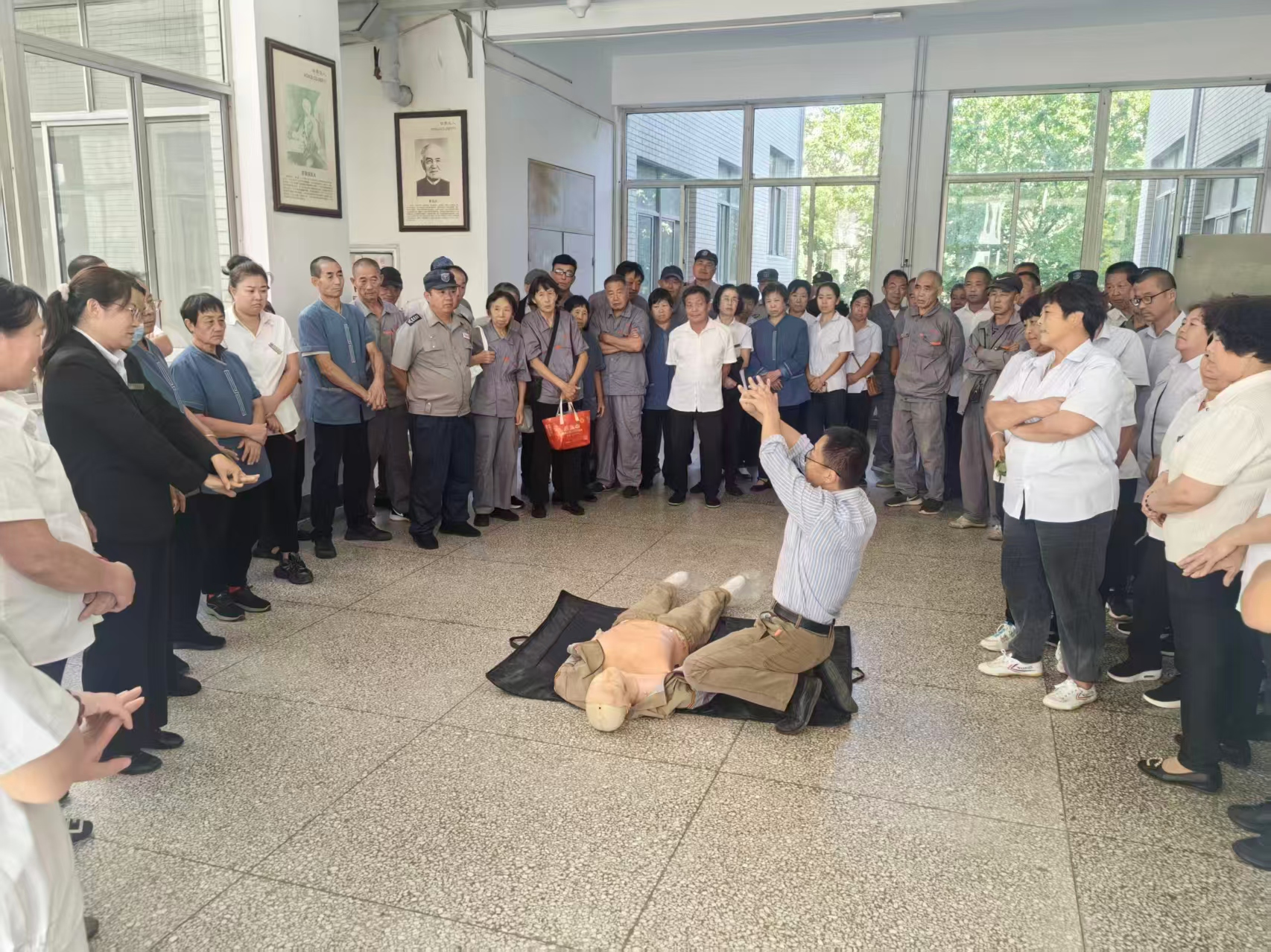 培训现场,胡志靖围绕“心肺复苏+AED使用+人工呼吸”三合一流程,边讲解边示范,将“叫-压-开-贴-电”五字口诀拆解为徒手按压、通气技巧、电极片贴放、除颤时机四组连贯动作;随后组织学员轮番上台,在模拟人身上体验每分钟100-120次的按压节奏,确保动作规范、节奏到位。